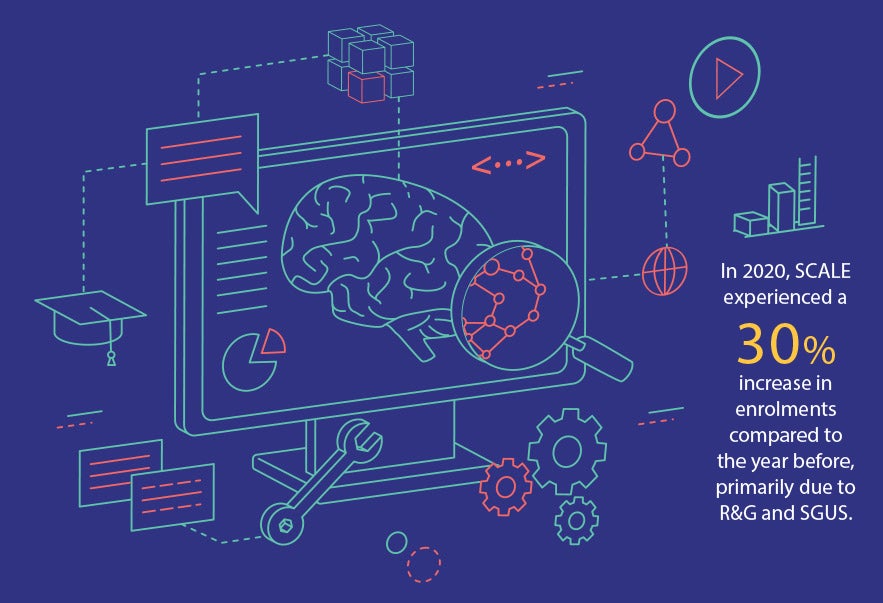 Interest in SCALE’s lifelong learning programmes has increased in the past year, notes Mr Punjabi. Some predate the pandemic, including the NUS CET500 catalogue of skills-based, industry-relevant courses for the public, and the alumni-only NUS Lifelong Learners programme. SCALE now also offers extra support to professionals and fresh graduates affected by COVID-19. Under the NUS Resilience & Growth (R&G) initiative, both the Class of 2020 and the Class of 2021 are given vouchers to offset the cost of CET courses. Meanwhile, NUS SGUnited Skills (SGUS) is a full-time training programme, launched in collaboration with SkillsFuture Singapore, to help jobseekers improve their employability.
