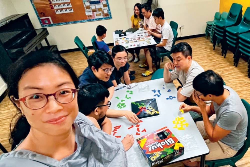 Ms Adeline Fam joins her husband, Mr Yap, and other group members in a spirited round of Blokus and Splendour.