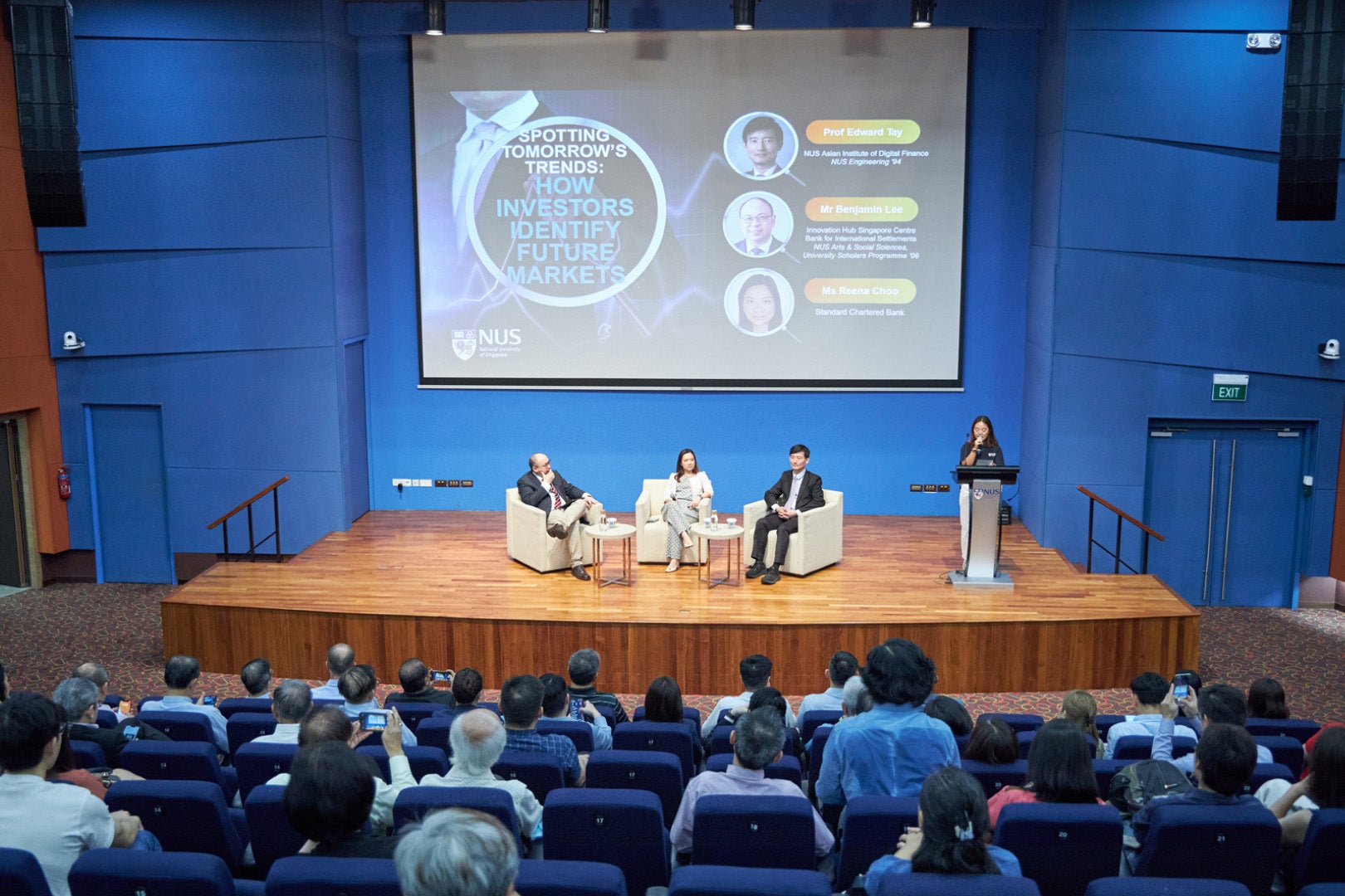 Amid the ongoing unpredictability in global markets, investors today face significant headwinds. Navigating this volatile environment was the focus of a panel discussion held on 12 February 2025 at the Shaw Foundation Alumni House, titled Spotting Tomorrow’s Trends: How Investors Identify Future Markets. The panel featured financial experts who discussed the evolving investment landscape in artificial intelligence (AI), blockchain, fintech and sustainability. Moderated by Professor Edward Tay (Engineering ’94), Adjunct Associate Professor at the Asian Institute of Digital Finance, NUS, the discussion included insights from Ms Reena Choo, Associate Director and Investment Advisor at Standard Chartered Bank; and Mr Benjamin Lee (Arts & Social Sciences +USP ’06), Senior Advisor at the Innovation Hub Singapore Centre, Bank for International Settlements (BIS).